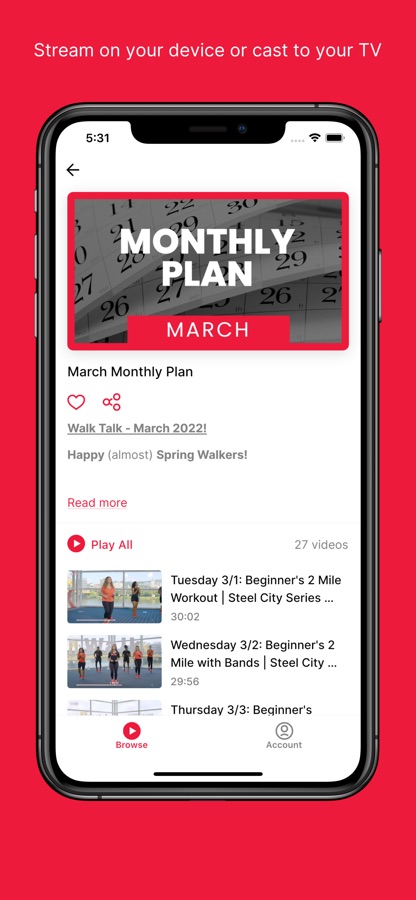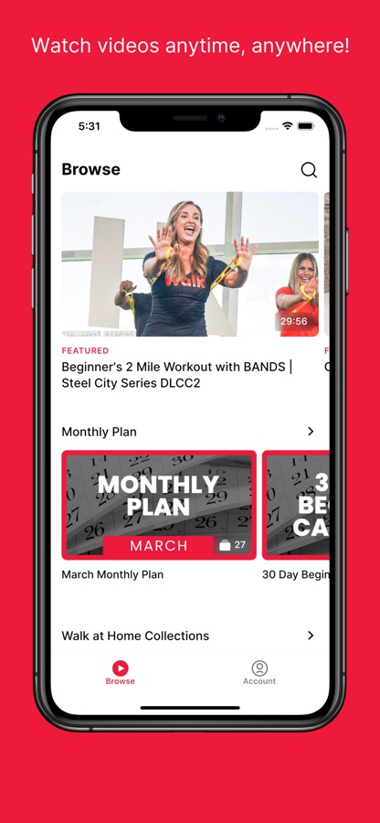 The Walk at Home App features a monthly plan of videos called Your Daily Walk! Plus access to hundreds of workouts in the Walk at Home library.