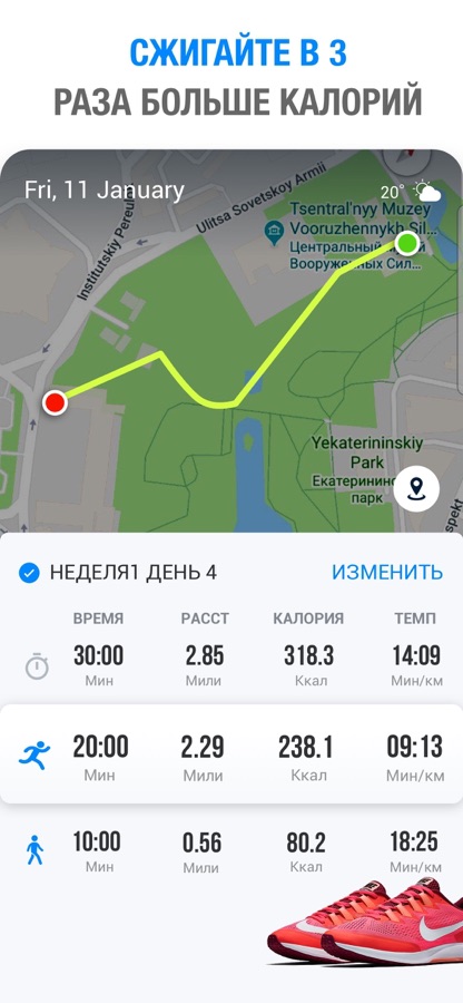 — Отслеживание калорий, расстояния, времени и темпа