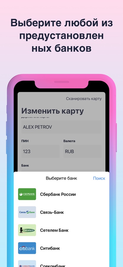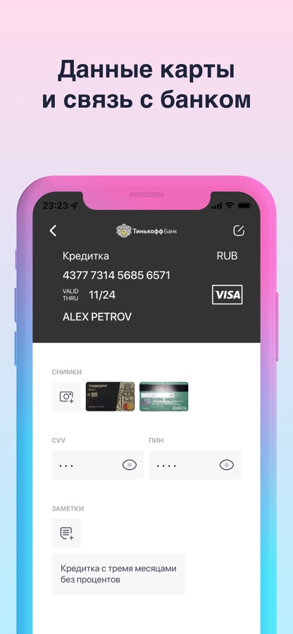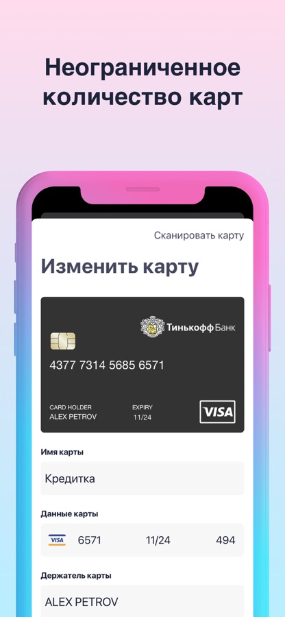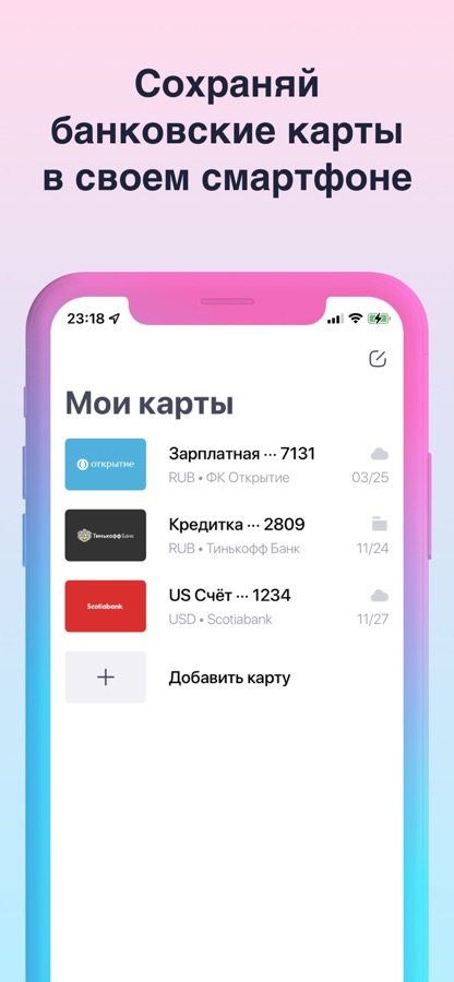 Наше приложение позволяет хранить информацию о ваших банковских картах. Все данные хранятся только в зашифрованном виде и разработчики не имеют доступ к ним!