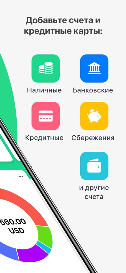Создайте столько счетов, сколько пожелаете! Добавляйте банковские счета, кредитные, дебетовые карты, ваучеры, контролируйте наличные и отслеживайте свои расходы на каждом отдельном счёте.