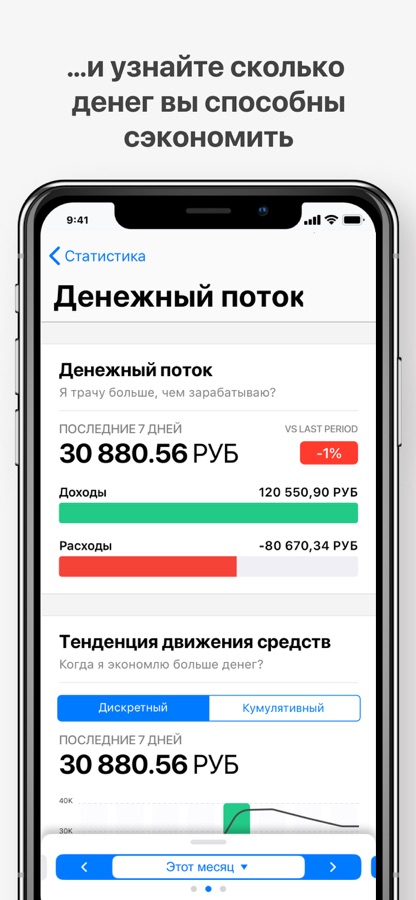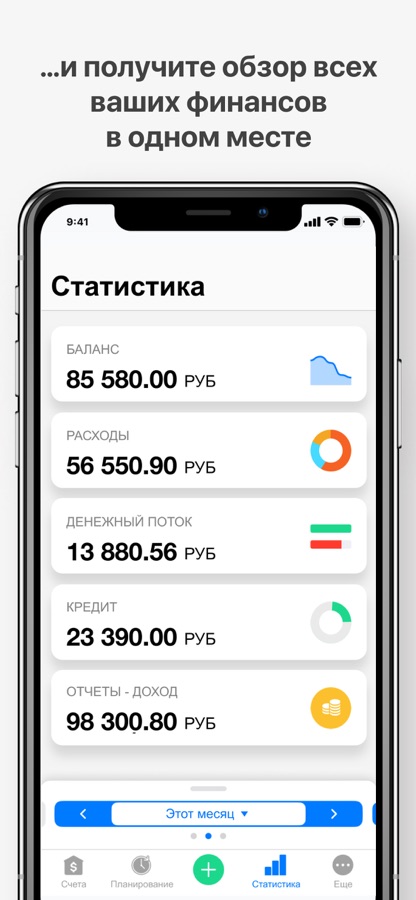 Простые, понятные графики и финансовые обзоры предоставляют подробную информацию о всех ваших расходах, доходах и актуальном состоянии баланса банковских счетов, кредитных и дебетовых карт, долгах и наличных деньгах.