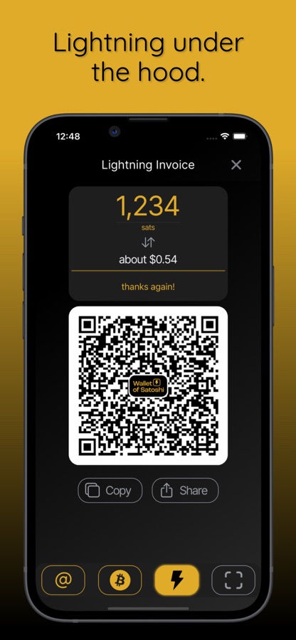 Send, receive, and spend Bitcoin instantly. Pay merchants by scanning a Lightning QR code, tapping an NFC card, or sharing your own custom Lightning Address. Use the built-in LNURL support to tip, zap, or connect with others, and explore a growing ecosystem of games, apps, and services built on Lightning.