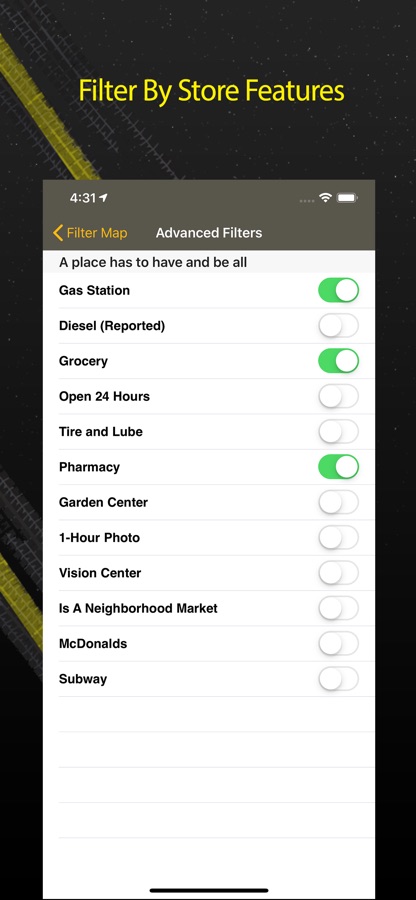 Filter map to see if has fuel, pharmacy, garden center, a restaurant and much more.