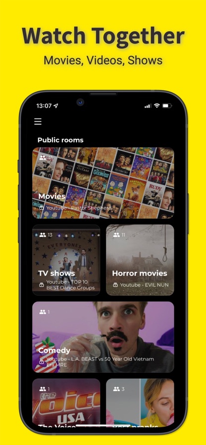 Don’t like the shows on the play? Create your private room and invite your friends there! You can build your community around shared interests and passions.