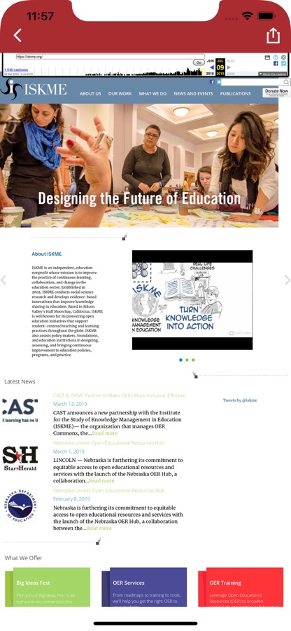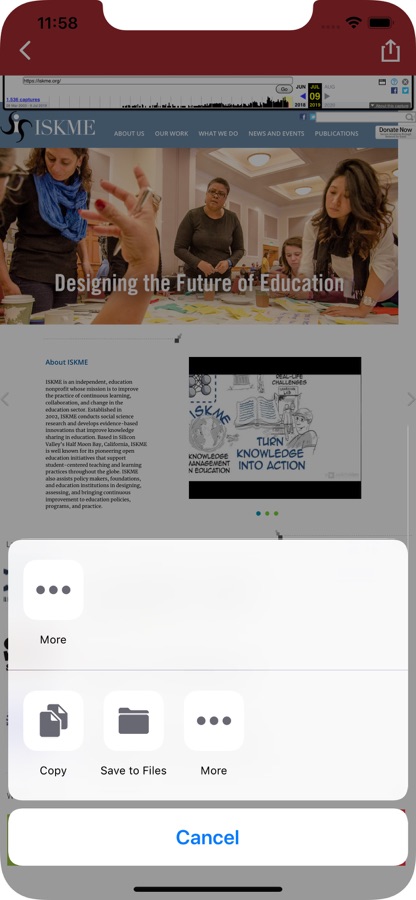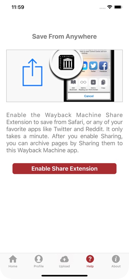 From Safari — select the «Share» icon at the bottom of the screen then select this «Wayback Machine» app.