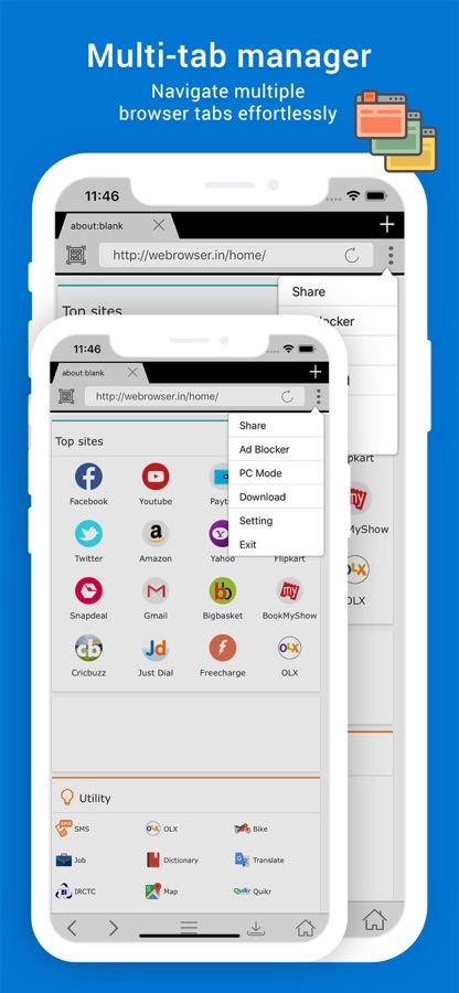 • Multi Tabs : It displays your open tabs, and lets you switch between them by swiping. Let you browse the web as PC Browser & desktop browser.