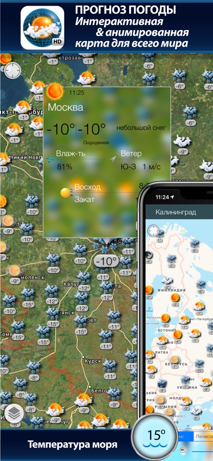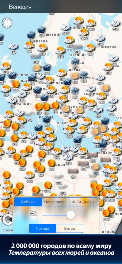 Прогноз погоды на карте в утреннем или вечернем выпуске «новостей» по ТВ знаком каждому. Теперь необязательно ждать очередного выпуска: программа показывает текущую погоду в любимом и привычном виде и прогноз на 10 дней, в любой удобный для Вас момент времени. В дополнении к прогнозу погоды программа отображает текущую температуру воды в морях и океанах.