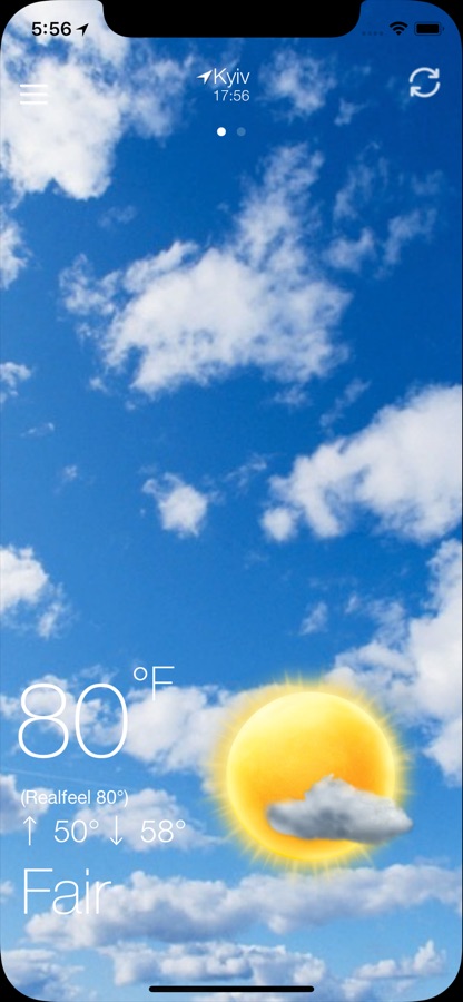 Приложение автоматически определяет ваше текущее местоположение и отображает подробную информацию о прогнозе погоды, такую как: