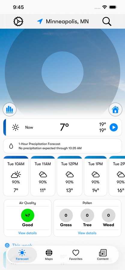 Hourly and 7-day forecast displays.