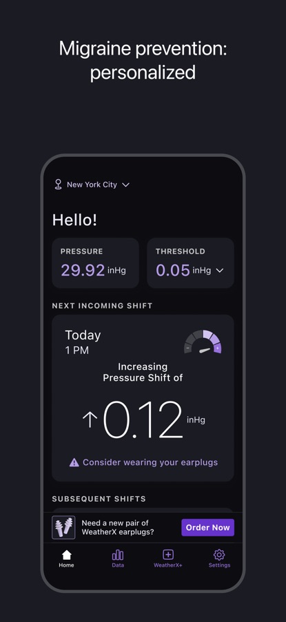 The WeatherX Forecast app is your solution to forecast barometric pressure changes. Use this app in conjunction with your WeatherX earplugs as a proactive approach to help manage your weather-related headaches.