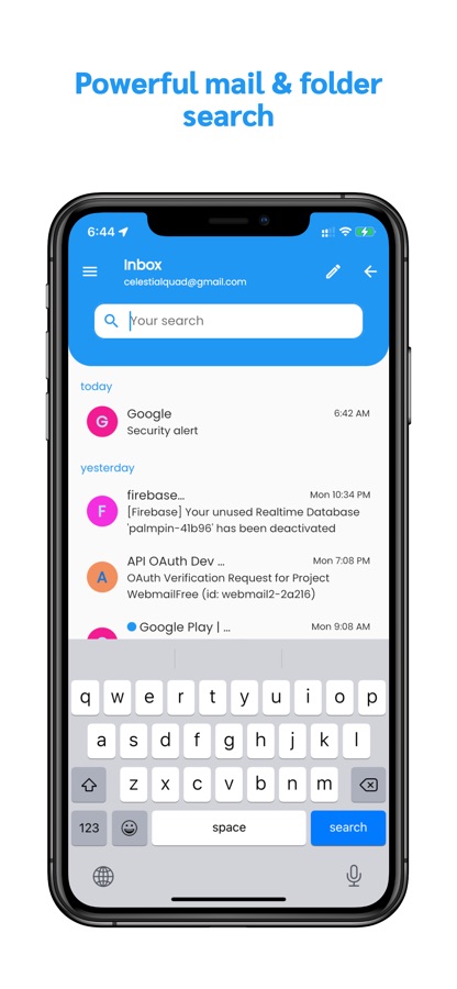 Simple and safe email application which will facilitate access, view and manage your email from your multiple email accounts at one place. Professional email client to handle your corporate email requirements. Stay upbeat with features of desktop email client power packed on your cellphone. Keep your critical device data safe from your all email recipients using latest security protocols and privacy protection. Webmail is available and supports multiple languages.