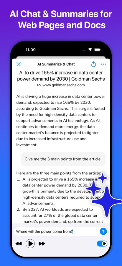 — Краткие обзоры контента и чат с использованием ИИ. Мгновенно составляйте краткие обзоры и задавайте вопросы по документам и веб-сайтам объемом до 300 страниц.*