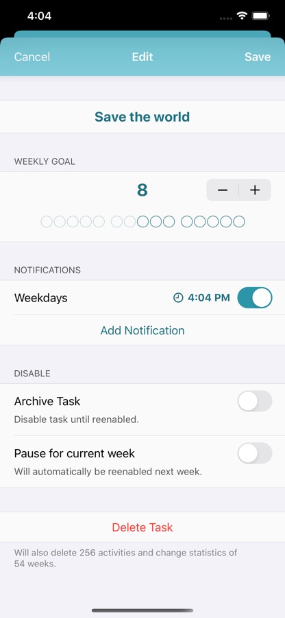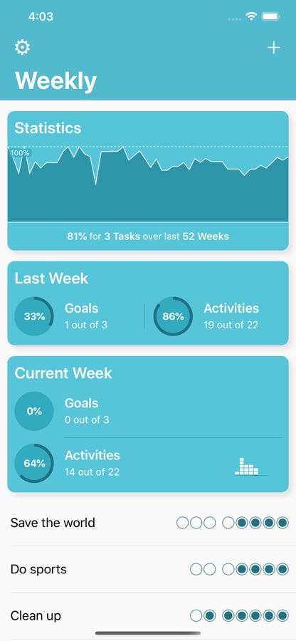 Everybody has tasks or goals they want to achieve on a regular basis. For some it is to do sports 3 times a week, for others the daily relaxation break. Weekly provides you an overview what you have accomplished this week and what you want to achieve. Appealing statistics help you to track your progress and keep your goal in mind.
