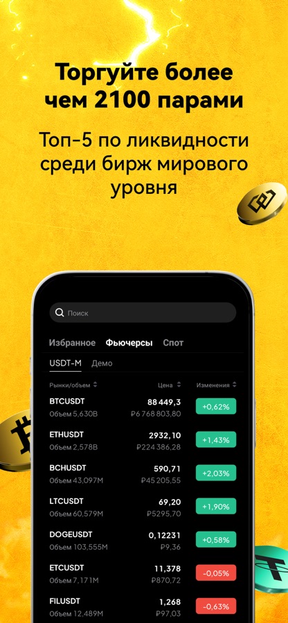 — Доступ к более чем 1700 торговым парам, включая BTC, ETH, популярные альткоины и мемкоины