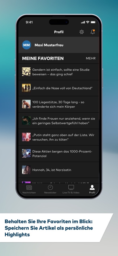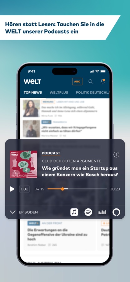 Hochwertige Videos, aktuelle Börsenkurse, lokale Wetterberichte und umfangreiche Bildergalerien machen diese App zum perfekten Begleiter durch den Tag. Personalisierbare Push-Nachrichten informieren Sie in Echtzeit, sobald etwas Wichtiges passiert oder Ihr Lieblingsautor einen neuen Artikel veröffentlicht hat. Bei aktuellen Lagen können Sie sich außerdem jederzeit via TV-Livestream informieren. Mit dem Newsticker bleiben Sie immer auf dem Laufenden, und wenn die Zeit gerade knapp ist, können Sie Artikel einfach im Profil zwischenspeichern. Außerdem können Sie sich die Startseite nach Ihren Vorlieben individuell zusammenstellen und jederzeit live das TV-Programm auf WELT verfolgen.