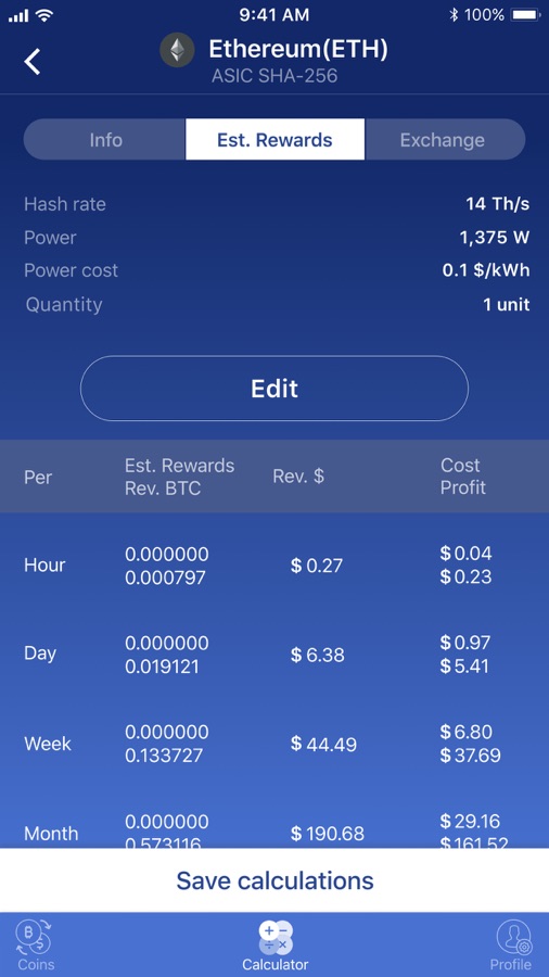 о результативности майнинга выбранной монеты, на заданном оборудовании.