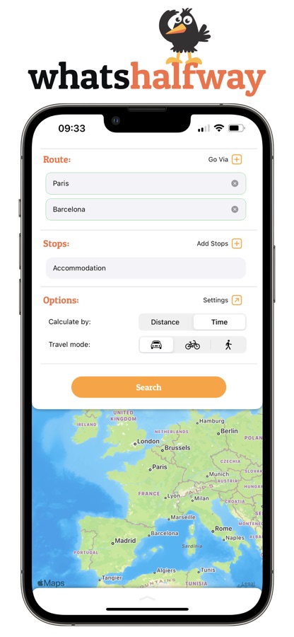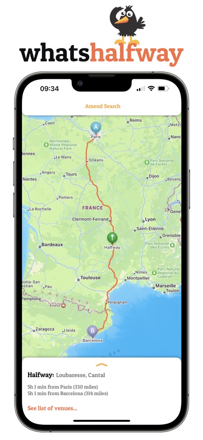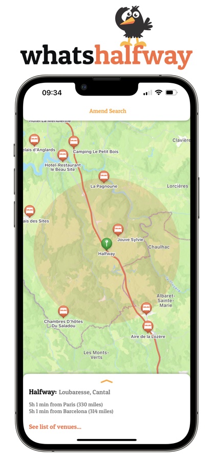 Split your journey by time or distance and find the perfect place to meet or stop halfway using the Whatshalfway app.