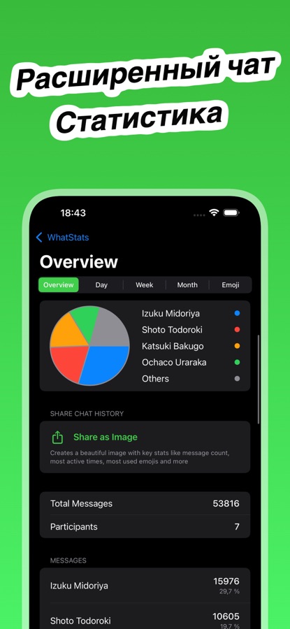 WhatStats — это приложение для анализа статистики ваших чатов в WhatsApp. Отслеживайте сообщения, использование эмодзи и многое другое!