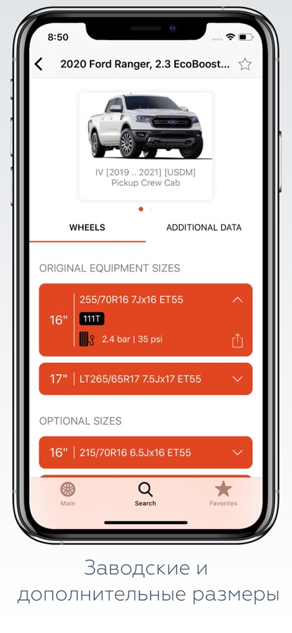 Это удобное приложение позволит получить корректные данные для подбора шин и дисков для автомобиля из крупнейшей в мире базы таких данных — с сайта Wheel-Size.com.
