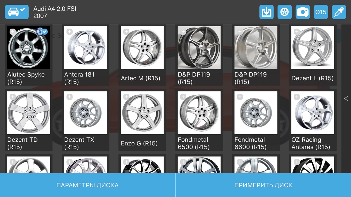 Огромное количество моделей дисков (Aez, Alutec, ATS, BBS, Borbet, Enkei, Mak, MSW, Oxigin, OZ, TSW и др.) позволят Вам определиться с тюнингом своего автомобиля. Достаточно лишь выбрать модель вашего авто или просто сфотографировать авто и примерять диски.