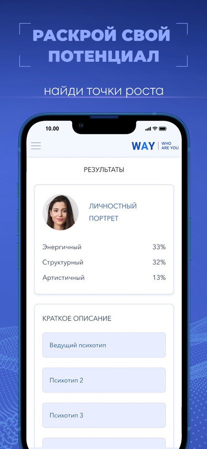 Алгоритмы ИИ позволяют изучить свою истинную природу и узнать свои уникальные особенности. WAY поможет построить гармоничные отношения с собой и окружающими людьми, даст подробные рекомендации к действию для раскрытия своего потенциала, самореализации и построению коммуникации с окружающими и отношения с партнером.