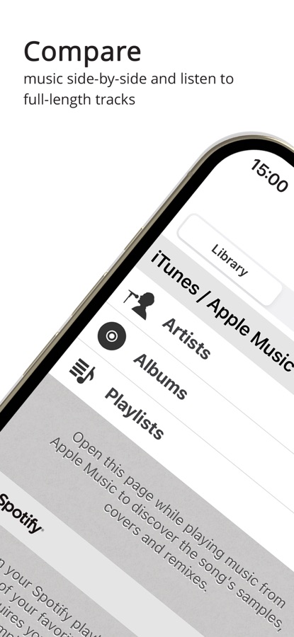 — Compare songs side-by-side and listen to full‐length tracks via YouTube (where available), Spotify (Premium required), or Apple Music (subscription required). Note: your iPhone must not be on silent/vibrate mode for audio playback.