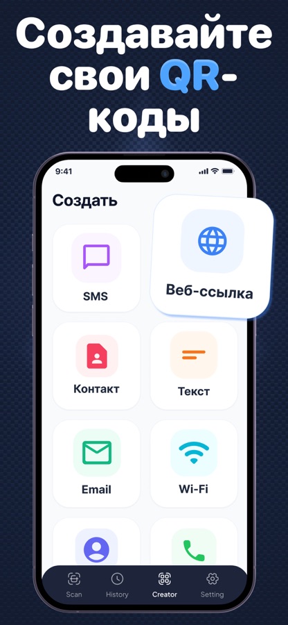 • Генератор QR-кодов: Создавайте QR-коды для Wi-Fi, сайтов, URL, текста, электронной почты, SMS, номеров телефона, контактов (vCard) и многого другого.