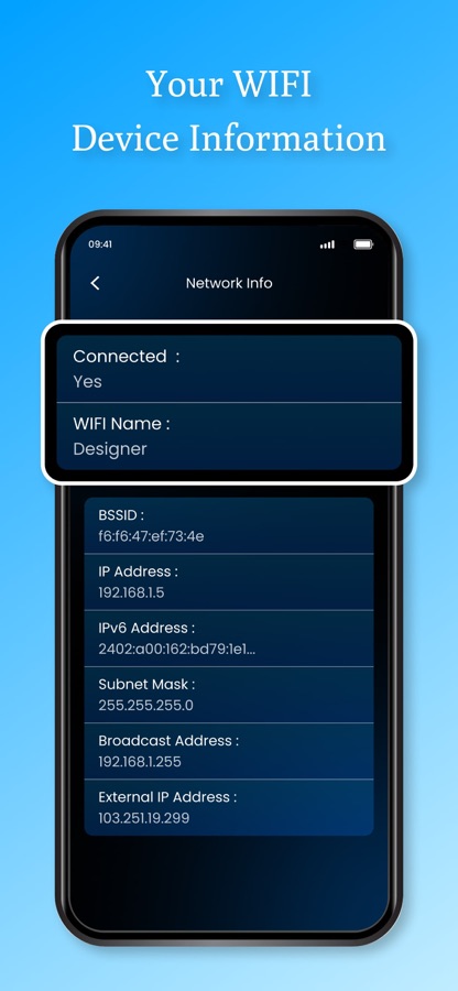 => Connection Info: View network information, WiFi name, IP address, IPv6 address, subnet mask, broadcast address and external IP address.