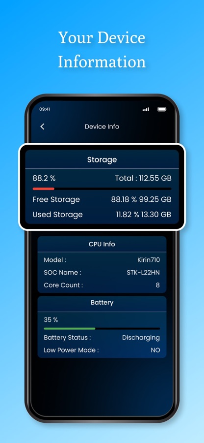 => Device Info: Display device information, storage to clear up space, CPU info, battery status and device details including name, model and operating system.