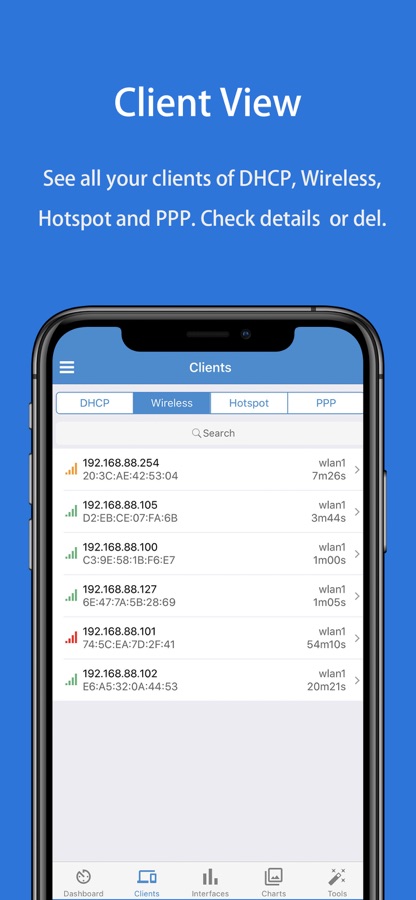• Client Management: View key router clients, DHCP leases, wireless registrations, active hotspots, and PPP sessions. You can check details and control these clients effortlessly.