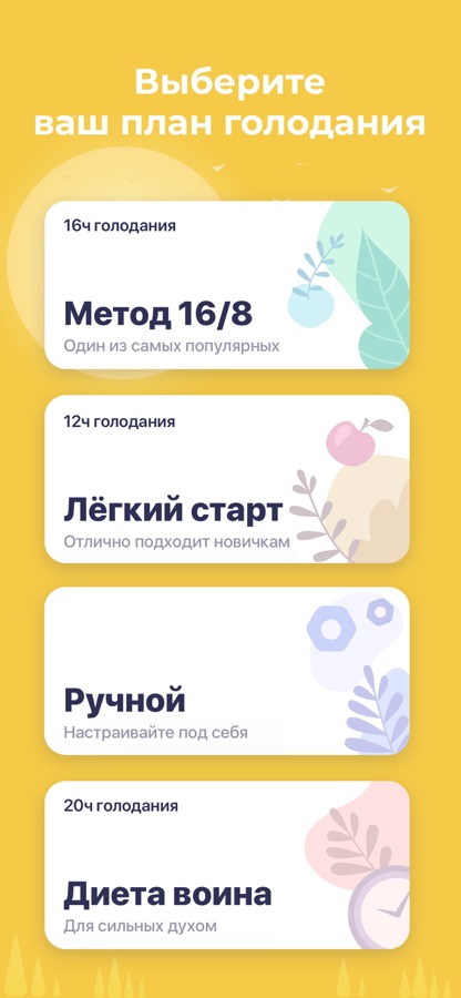 • Все вариации планов голодания – свободно выбирайте планы голодания в зависимости от вашего расписания и уровня подготовки.