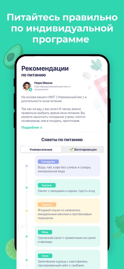 • Индивидуальный план питания – получите рекомендации нутрициолога, что есть на завтрак, обед и ужин. Подходит для вегетарианцев!