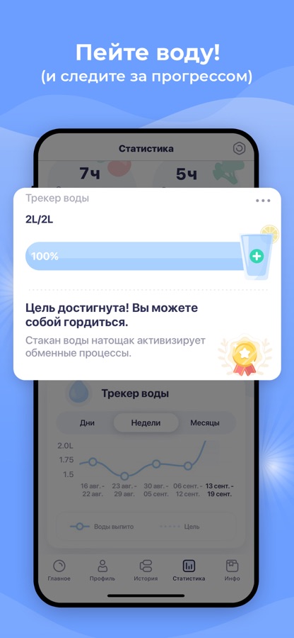 • Расширенная статистика – отслеживайте ваш прогресс в потреблении воды, изменении веса, самочувствия, и др.
