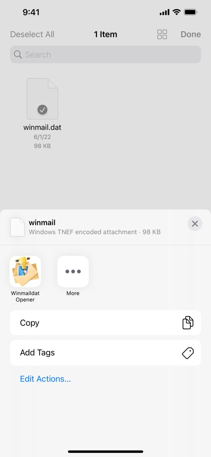 Приложение регистирует себя как обработчик файлов .dat. Оно открывается, когда вы пытаетесь открыть вложение «winmail.dat», и показывает вам все вложенные файлы. Затем их можно просмотреть, переслать, распечатать или сохранить в альбом.