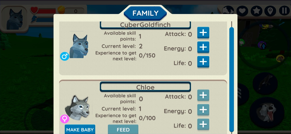 Вы можете создать семью если найдете другого волка. В дальнейшем, с развитием персонажа, станет доступной возможность делать детей. Ваша семья может помогать вам в бою и охоте. Существует возможность улучшать персонажей семьи. Для этого нужно охотится и собирать еду, чтобы в дальнейшем накормить детей и жену (или мужа, если персонаж женского пола).