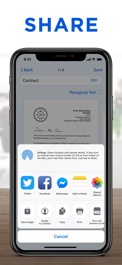 * Share scans separately or send a number of files in one PDF file Mail, iMessage or save to camera roll