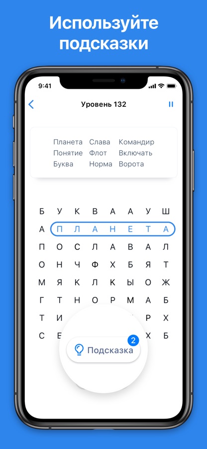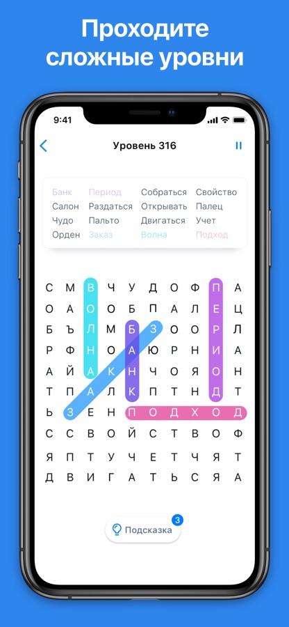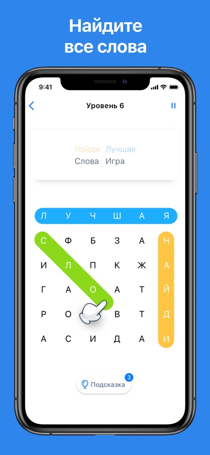 Проводите по экрану сверху вниз, снизу вверх, слева направо, справа налево и по диагонали, чтобы отмечать найденные слова.