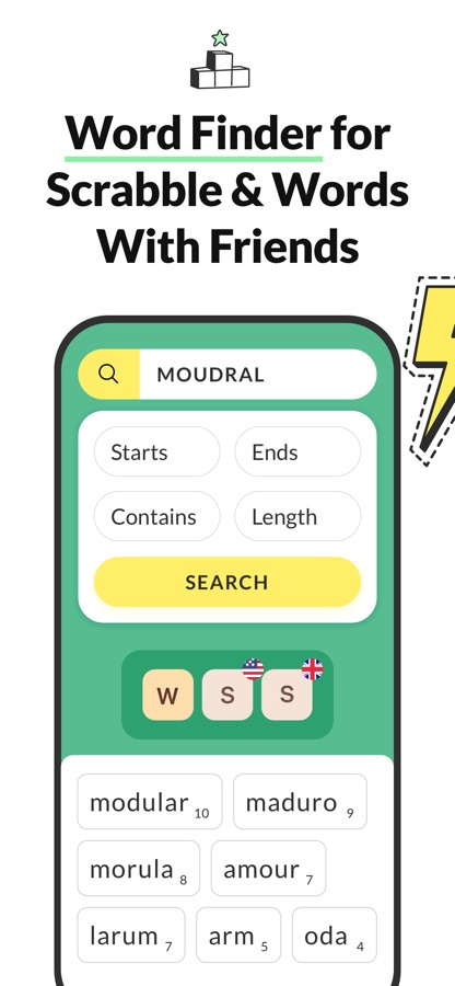 — Official Dictionaries: Supports Scrabble US, Scrabble UK, and Words With Friends dictionaries.