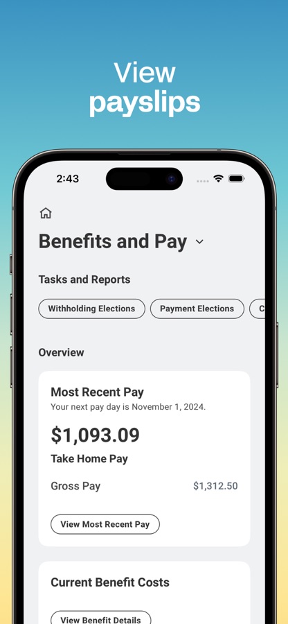 • Быстро проверять платежи, просматривать или подавать заявления на отпуск, регистрировать приход на работу и уход с работы, а также отправлять табель рабочего времени и отчеты о расходах.