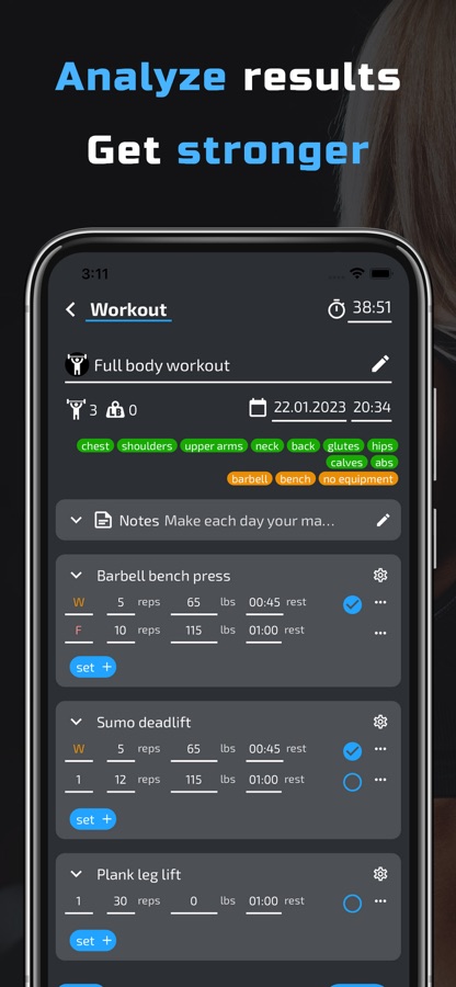 Отмечайте выполненные подходы, поднятый вес. Анализируйте историю и статистику.