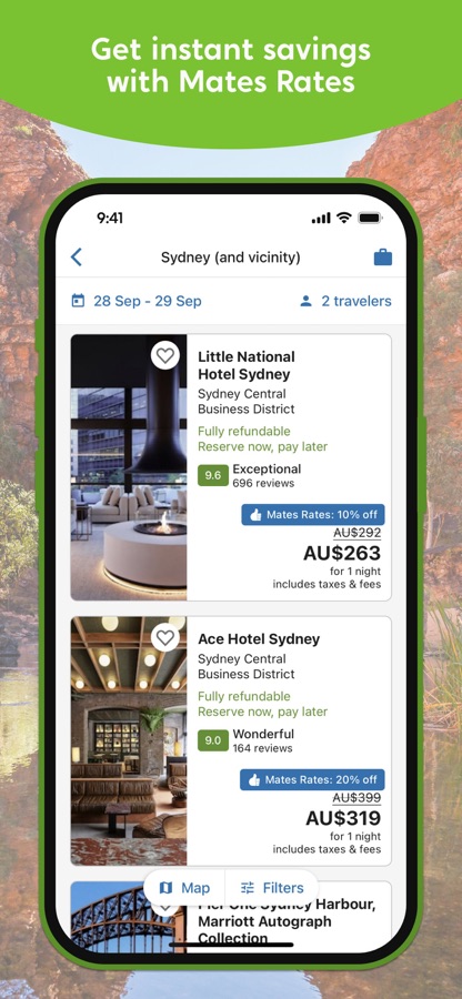 Our mates get instant travel discounts on selected hotels, flights, car hire, activities and more. Sign in on the app and save 10% or more on over 100,000 hotels worldwide with Mates Rates, plus up to 35% when adding select hotels to your flight.