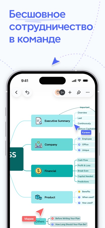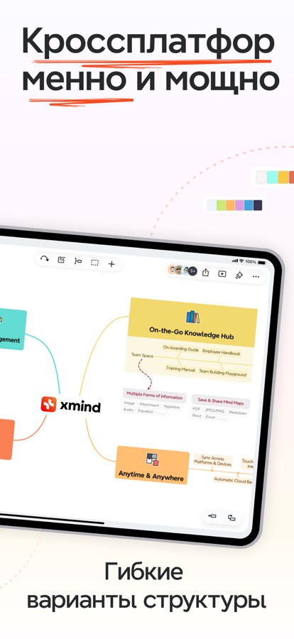XMind позволяет работать над картами вместе с коллегами через облачный сервис XMind Cloud. Вы создаёте карту, делитесь ссылкой, и участники могут редактировать её в реальном времени. Приложение синхронизирует проекты между iPhone, iPad и Mac через iCloud, поэтому вы можете начать мозговой штурм на телефоне в дороге, а завершить на компьютере в офисе. Для быстрого обмена картами поддерживается AirDrop и экспорт в файлы .xmind. На iOS доступна интеграция с приложением «Файлы», что упрощает управление документами.