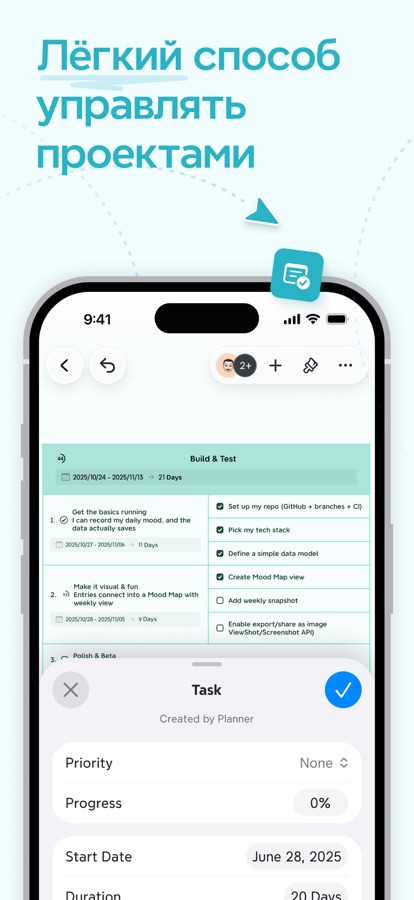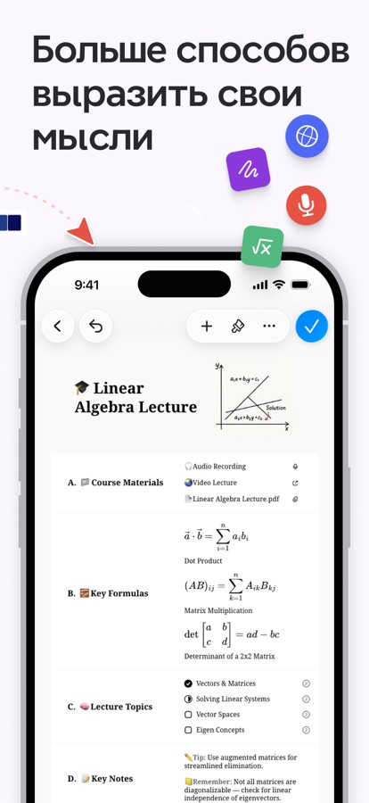 XMind даёт полную свободу в визуальном оформлении карт. Вы меняете цвета, шрифты, формы узлов и толщину линий. Встроенная библиотека содержит сотни иконок, стикеров и флагов, которые помогают выделять приоритеты и категории. Готовые темы оформления позволяют мгновенно изменить внешний вид всей карты одним касанием. Приложение поддерживает добавление ссылок на веб-страницы, файлы из iCloud Drive, а также аудиозаметки и формулы LaTeX. Все изменения сохраняются в истории версий.