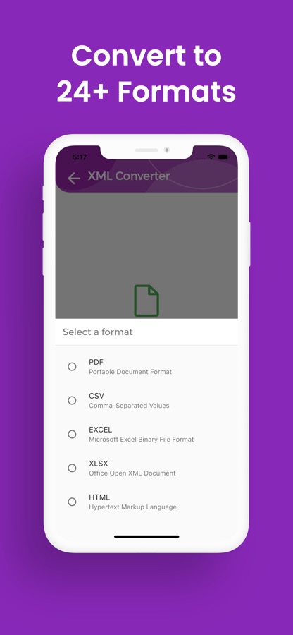 Прекратите бороться с файлами, которые ваше устройство не открывает. XML Конвертер позволяет вам преобразовывать любой XML или конвертировать десятки форматов обратно в XML, сохраняя каждый элемент структуры и содержимого.