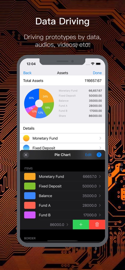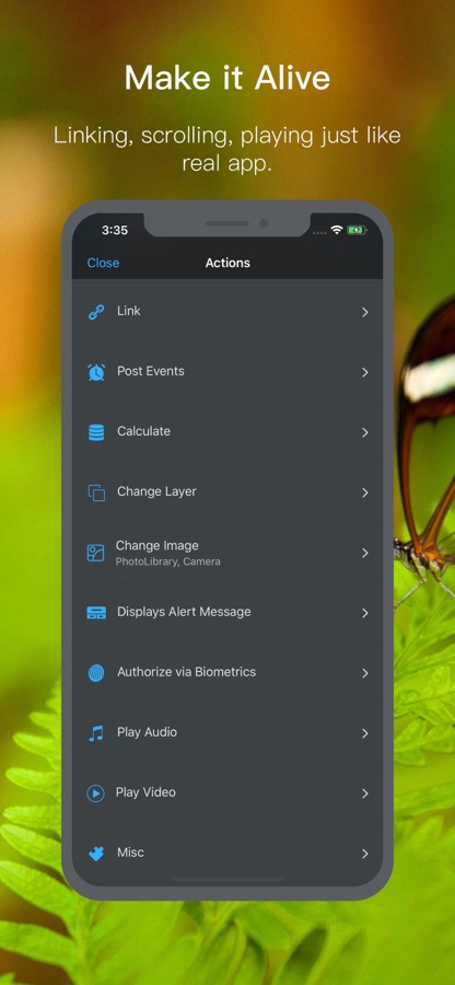 ○ add touches, gestures, shakings, timers, data-monitors, AV events, or other triggers for mobile prototyping.