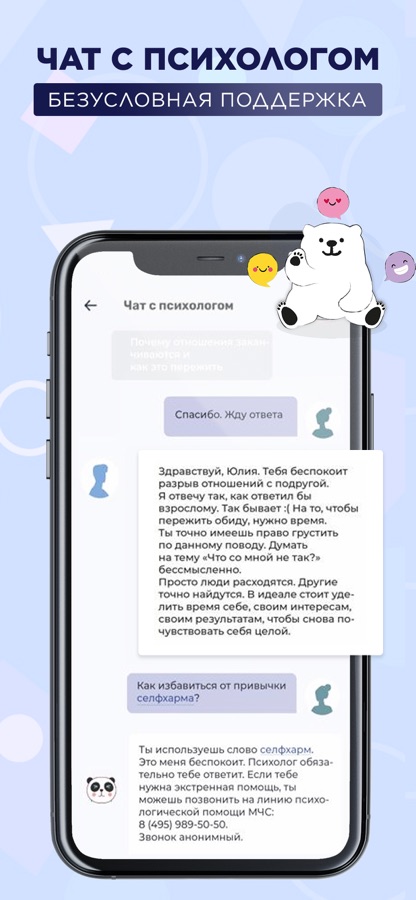 * Профессионализм. В разработке приложения принимали участие практикующие специалисты. Поддержкой чата занимаются психологи с опытом более чем 7 лет.