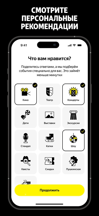 В приложении можно выбирать билеты на фильмы, спектакли, концерты и другие события через фильтры и рекомендации