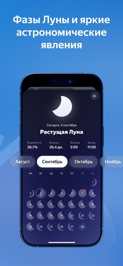 — Приложение Яндекс Погоды включает в себя широкий список погодных параметров: температура, осадки, видимость, скорость и направление ветра, параметр ощущается как, прогноз магнитных бурь, атмосферное давление, восход и закат солнца, фазы луны и другие.