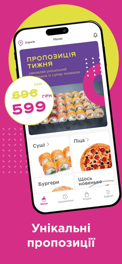 Доставка смаколиків для кожного. Замовляй суші, піцу, сети, гарячі страви, десерти, та багато іншого.