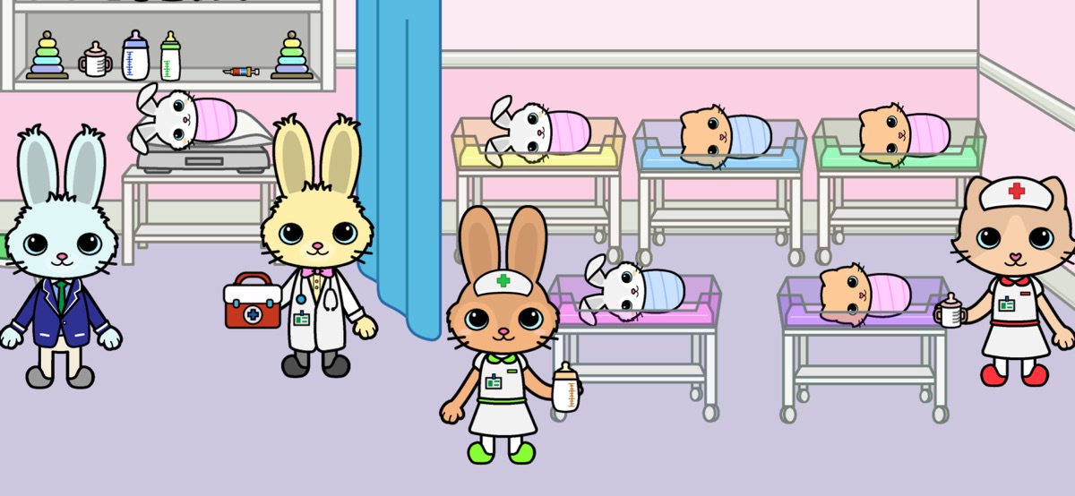 In the hospital new moms give birth to baby bunnys and baby kittens! Visitors bring gift baskets and flowers to their loved ones. Sick patients arrive in the ambulance and have X-Rays and take medicine.